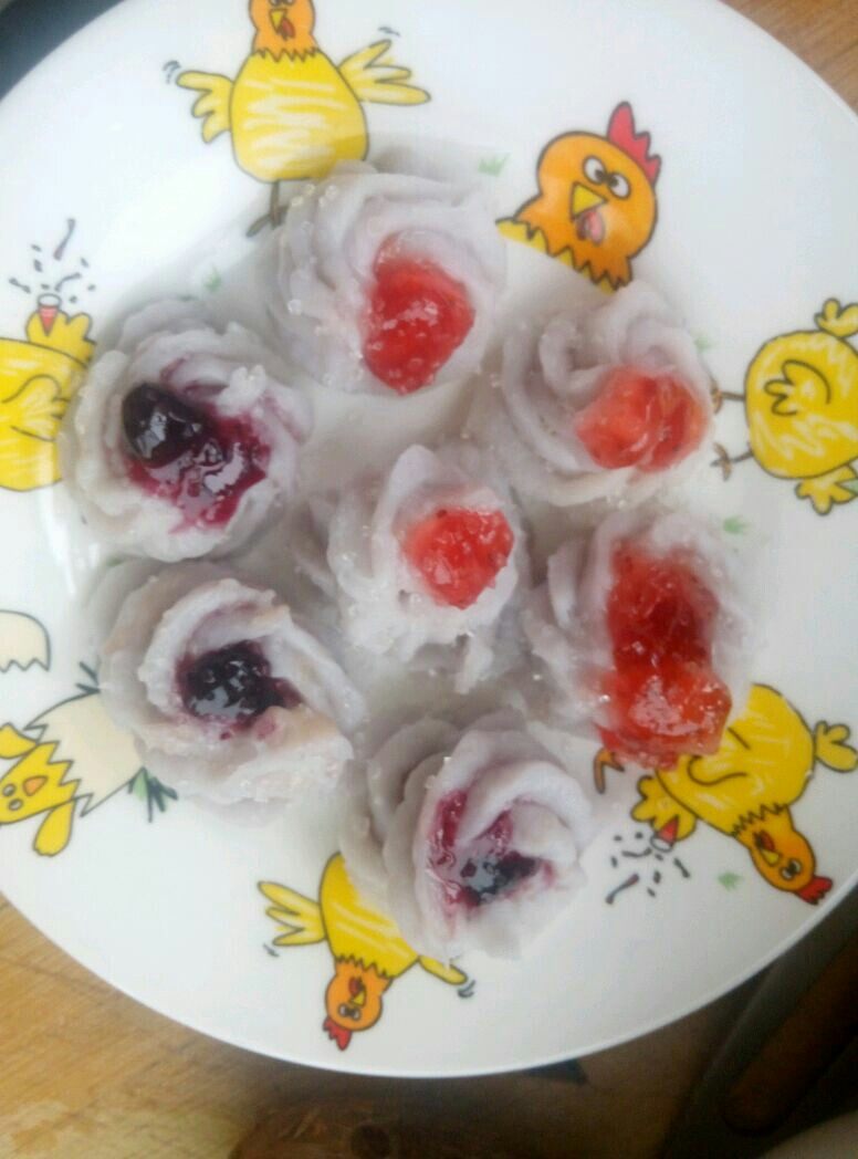 4:把做好型的芋头放上果酱,最后放一点白糖,