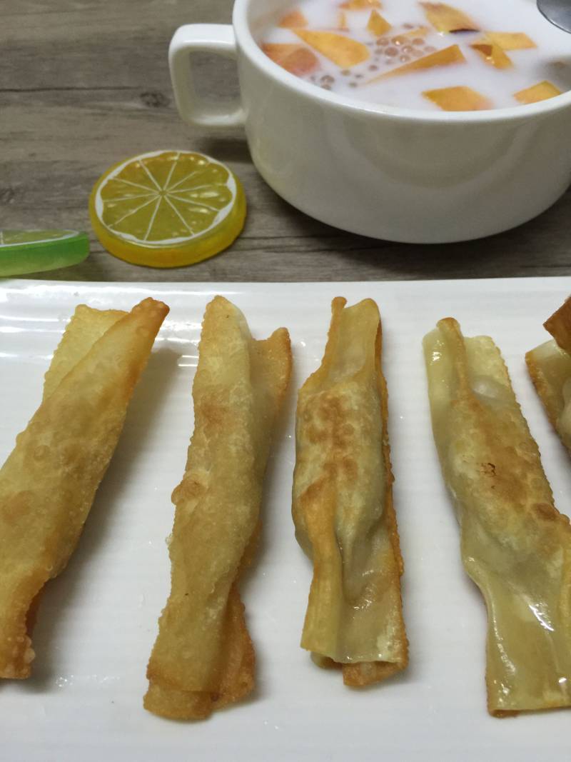 7:不粘锅放入些许油。放入包好的芋头糖果把它们煎金黄即可。喜欢油炸的朋友可以直接油炸。