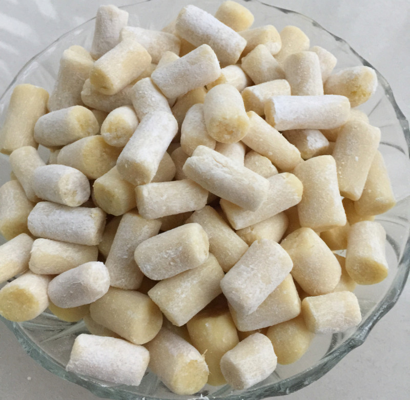 7:案板上洒些木薯淀粉,分小团,搓长条,用小刀切成大小差不多的小段N个。