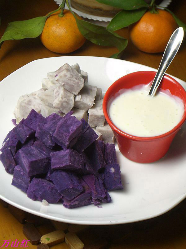 5:蒸熟的紫薯和芋头都切丁,分别摆放在盘中。