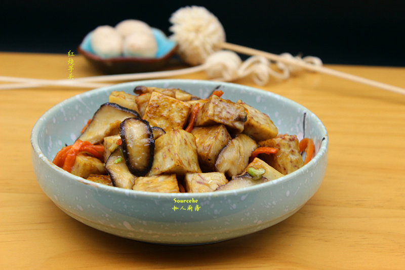 5:把炸过芋块的油,倒出,锅中留一点点有,爆香香菇片,胡萝卜丝;
