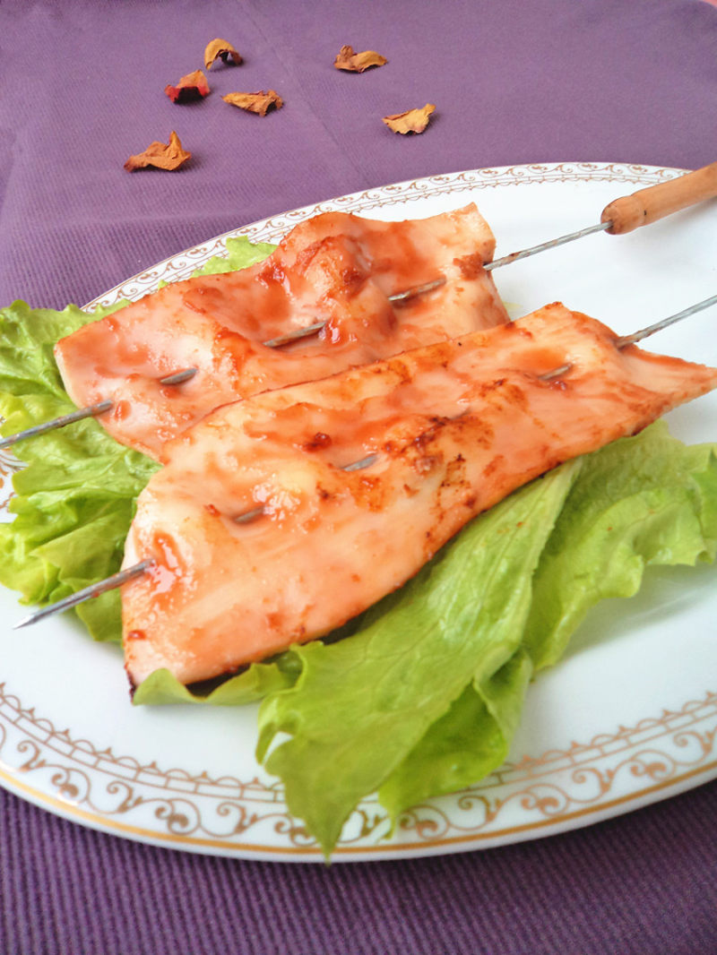 7:将酱汁刷在鱿鱼上。
