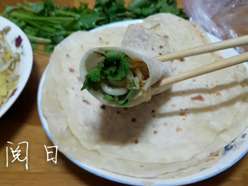 11:炒了豆芽卷里边,再抹上酱,放点香菜,葱丝,黄瓜丝,火腿,很棒。