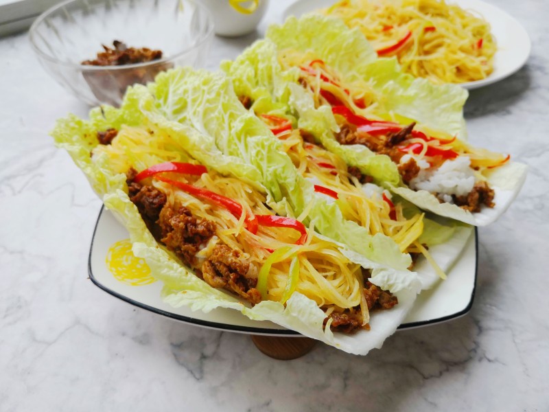 9:先取一片白菜叶,抹上适量的鸡蛋酱,再放入白白的大米饭,最后来一些炒好的尖椒土豆丝,一个包饭就做好。