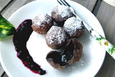 3:3.保持小火加热,听到汤圆发出轻轻的砰的一声,表面微微膨胀炸开,就可以捞出,沥净多余的油,装盘,洒糖粉,也可以蘸点儿蓝莓酱之类的,看个人喜好吧