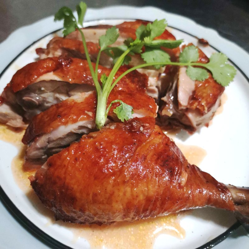 6:斩成块,将烤出来的汁水浇在鸡腿表面,放一根香菜做点缀就完美了,外焦里嫩,不比肯德基的奥尔良鸡腿差哟。