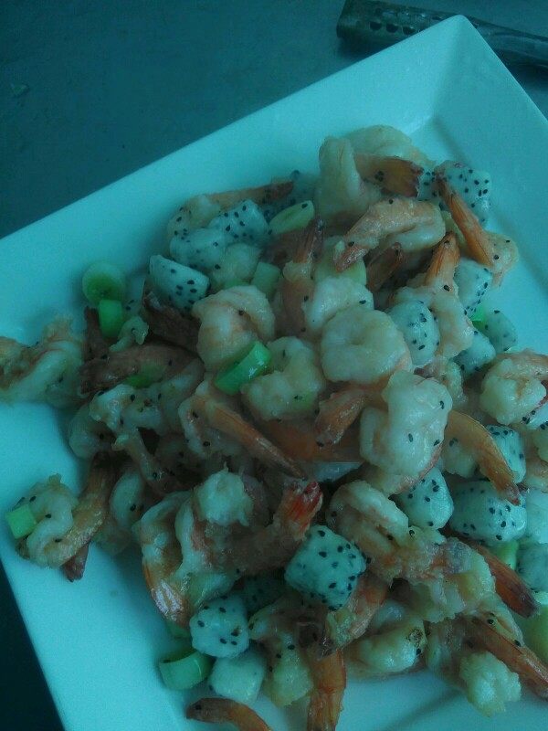 6:放葱花蒜炒一下,再放虾火龙果,加盐,味精,糖拌匀出锅。