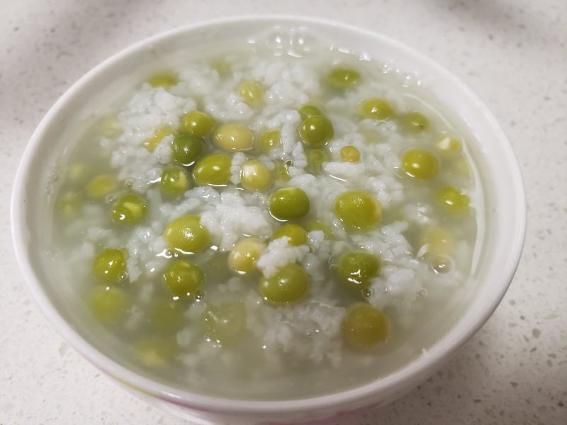 4:将大米和豌豆一同放入锅中,加适量的水,开始熬煮半个小时。