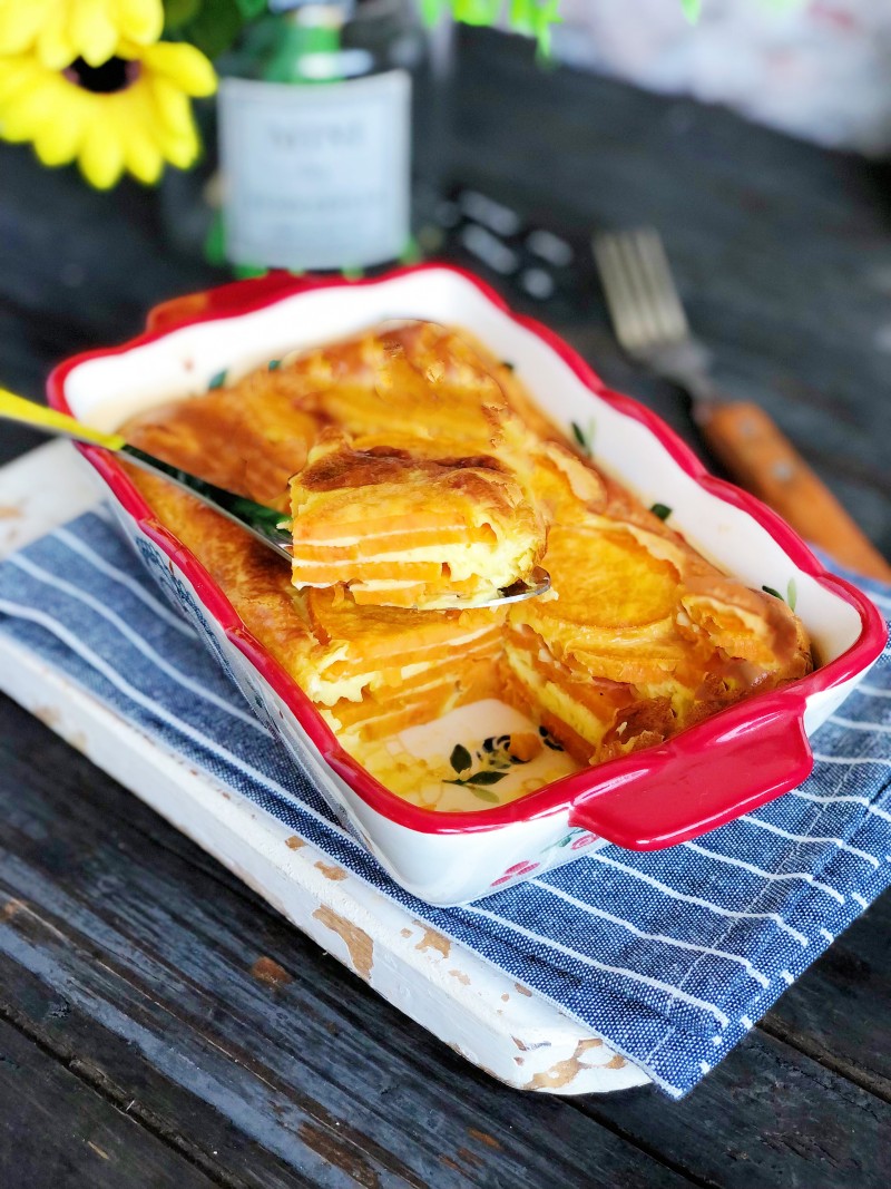 6:烤好出炉,晾至不烫就可以开动啦,用刀可以轻松切开,一层层的红薯片,中间夹杂着滑嫩的蛋奶布丁,每一口都是享受~