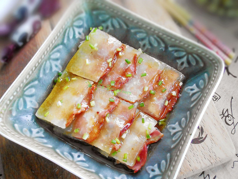 4:将培根切片均匀码放在笋上,入蒸锅蒸7分钟即可