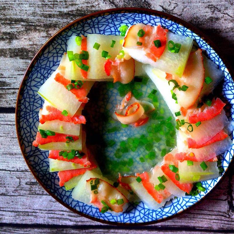 7:出锅时撒上几粒青蒜末,培根味道浓郁,冬瓜清香脆嫩,味道棒极啦