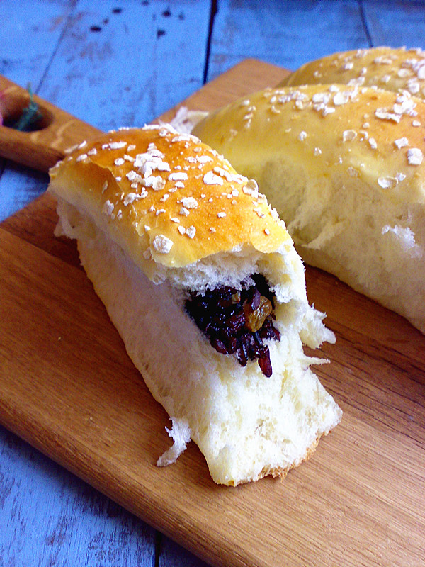紫米适量;葡萄干适量;蜂蜜适量;表面蛋液适量;即食燕麦片适量;
