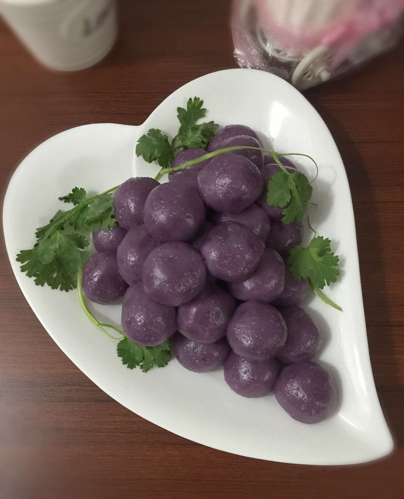 9:蒸好的紫薯葡萄用叶子点缀一下