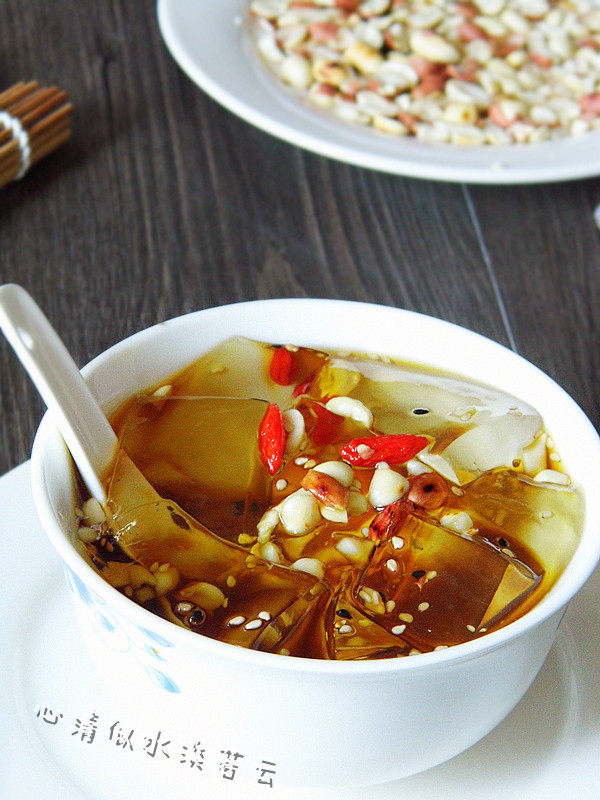 6:将冷却凝固后的放冰箱冷藏,加上红糖水、花生米和山楂片。