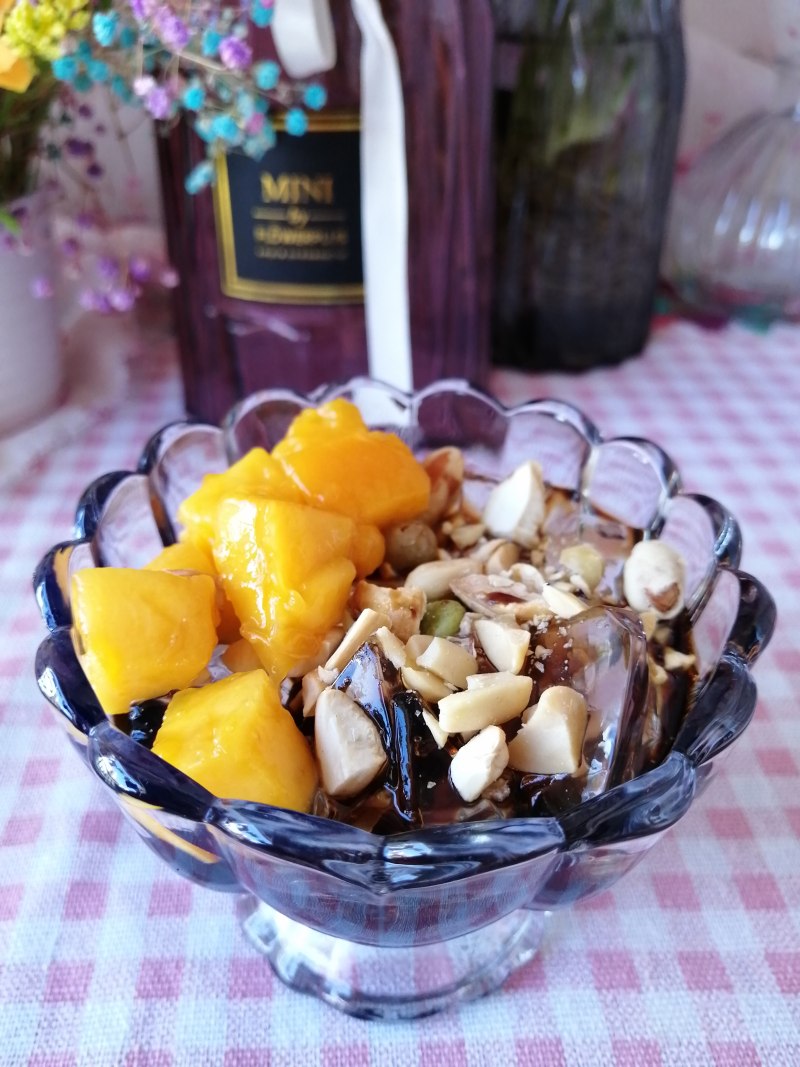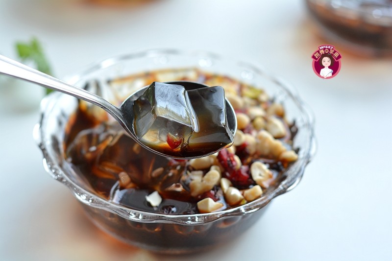 11:取干净的碗,先在碗底舀几勺红糖浆,再将冰粉块舀入碗中,表面撒坚果碎、水果丁,红糖也可淋在冰粉上,边吃边拌,红糖浆均匀地混合着冰粉,吃一碗,凉爽开胃。