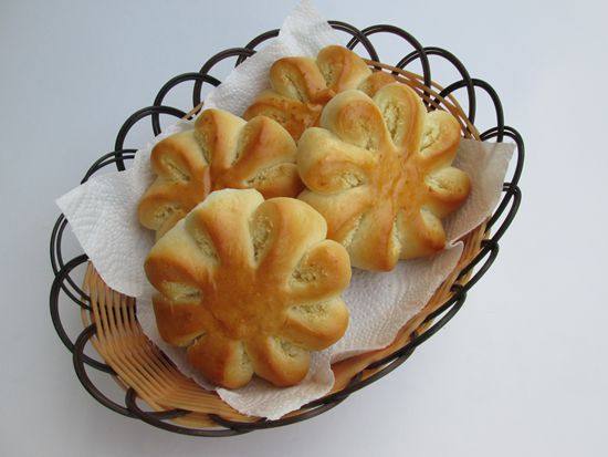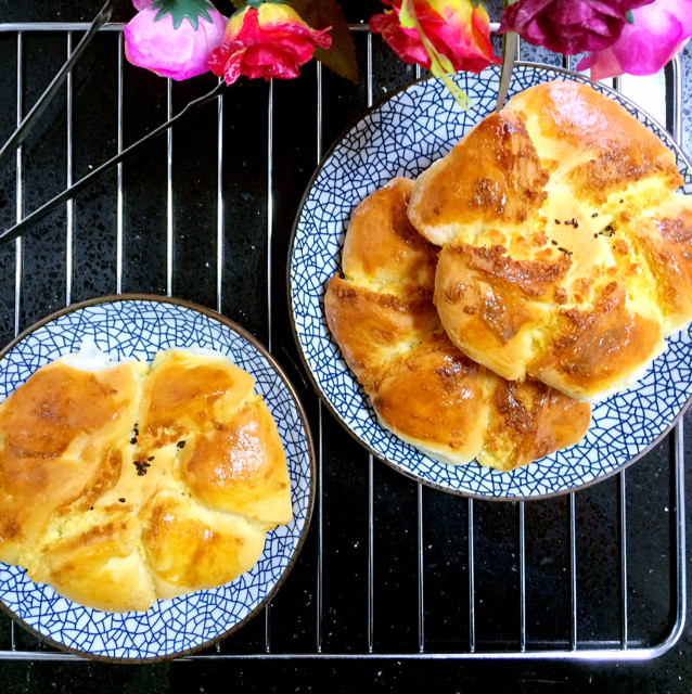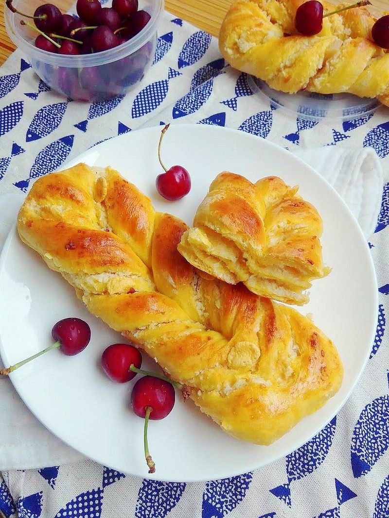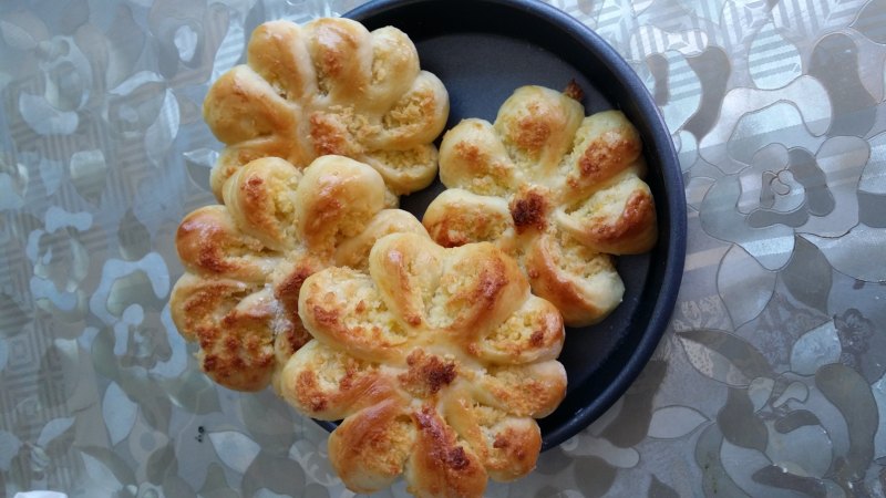4:把椰蓉包入面团,做成喜欢的形状。我做了两种:菊花状:把包了椰蓉的面团压扁,切出花瓣,每个花瓣旋转90度。麻花状:面皮椭圆形,包入长条状椰蓉,封口向下,压扁,擀成长椭圆形,中间切一刀,两头不切断,然后抓住两头扭成麻花状。