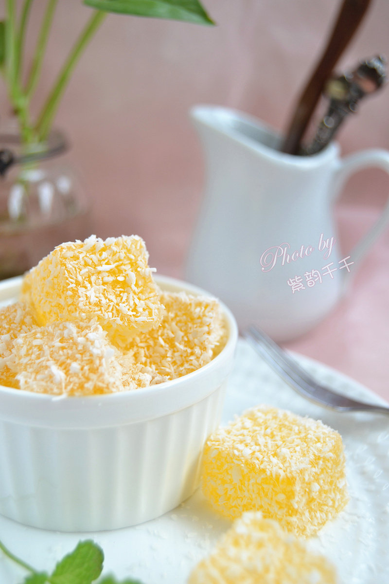 8:将凝固的果冻取出切成小块,粘上椰蓉即可食用。