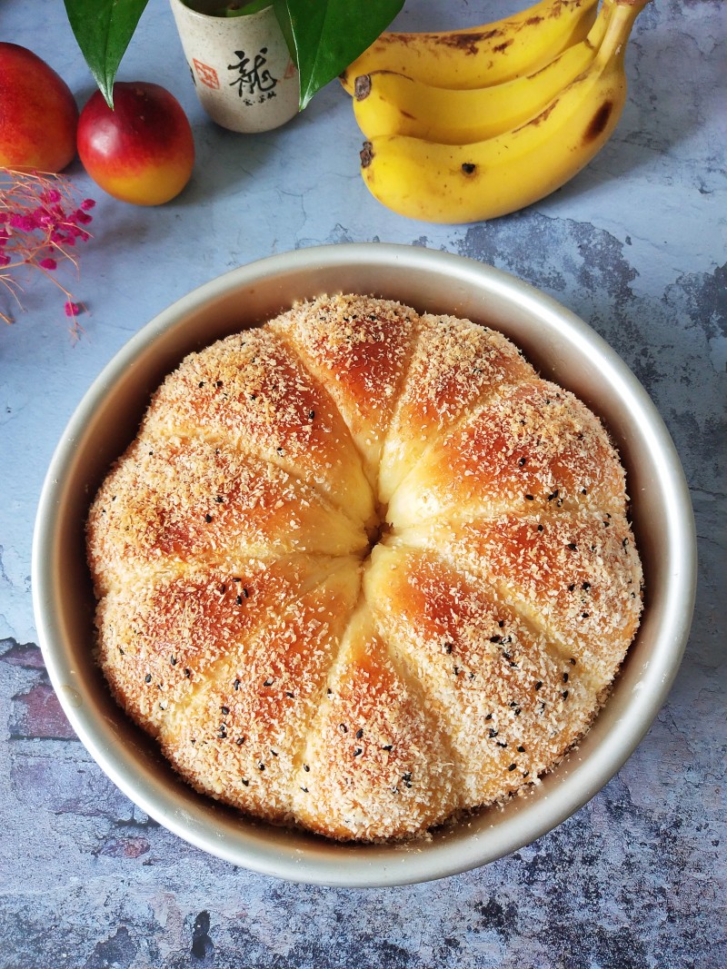 6:再把每一等份从中间切开,但不要切断,向两边掰开,一个好看的椰蓉包就成型了。