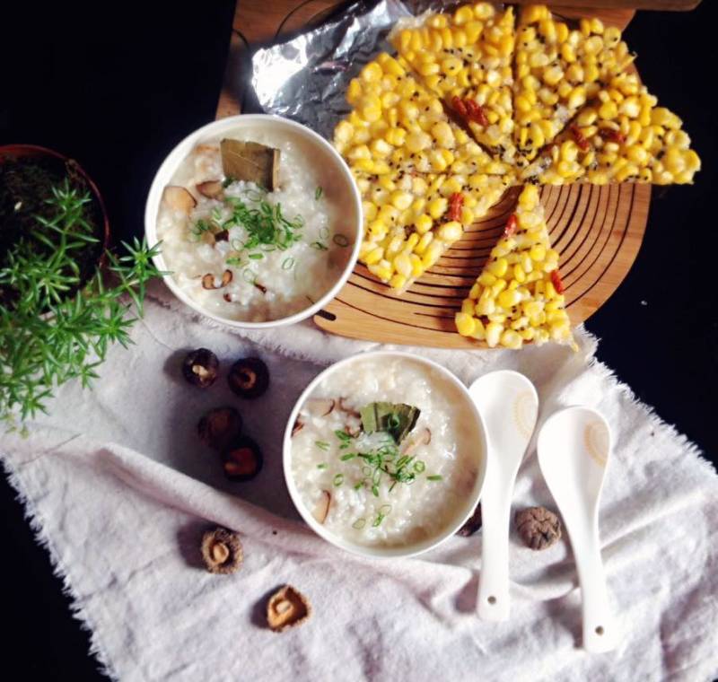 3:锅内放少许油,入香菇炒出香味,倒入腌好的鸡胸肉,在鸡肉半熟时倒入煮好的荷叶粥,利用粥的温度烫熟鸡肉更滑嫩些。