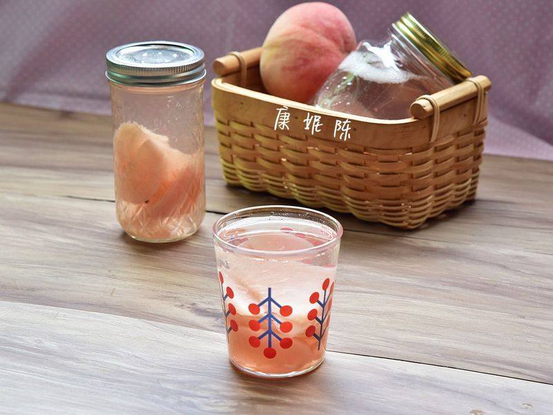 4:水蜜桃水放凉后,和气泡水1:1注入杯子里,冷藏后再品尝