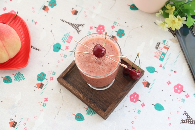 6:程序结束后,倒入玻璃杯中即可,浓郁的水蜜桃味道带有一点樱桃的酸甜,很是可口哟。