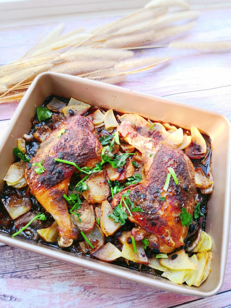 3:我的是1-2个人的小烤箱,烤盘有点迷你,刚好够放个大鸡腿,配菜铺垫在底下,放之前我现在烤盘上铺了一层锡纸。这样方便清洗哈