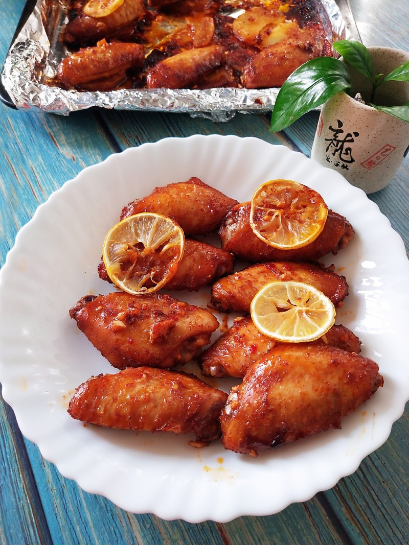 7:料汁倒在鸡翅上,柠檬洗净切片放在鸡翅上。