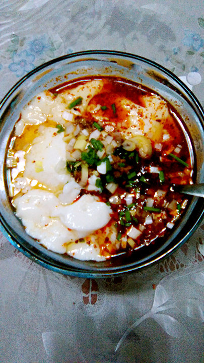 3:加上各钟作料,一碗麻辣鲜香,爽滑可口的豆腐脑放在面前,是不是很诱人啊,
