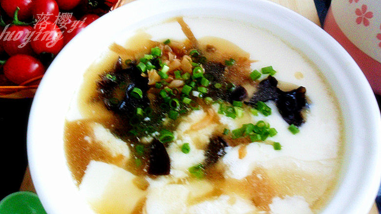 12:将煮好的卤汁,轻轻的浇在凝固的豆浆上,撒上榨菜碎块和香葱(或香菜)即可。