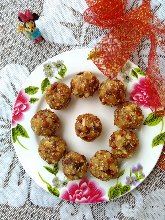 1:用料:白糖83克,白芝麻15克,瓜子仁5克,核桃仁5克,南瓜子仁5克,圣女果干10克,花生10克,糖玫瑰6克,冰肉16克,半边梅6克,饴糖8克,全蛋6克,熟火腿丁41克,熟面粉20克,水5克,玉米油8克