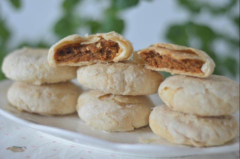 面粉540克(300克水油皮用,240油酥用);糖40克(水油皮);水125克(水油皮);猪油220克(100克水油皮用,120克油酥用);