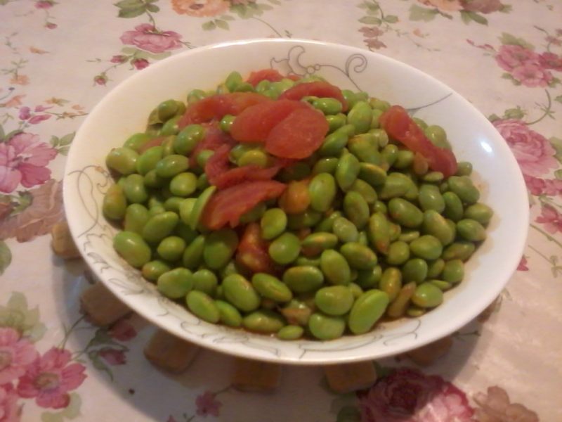 2:锅中放适量油,油热后放入蕃茄炒几下放入青豆米,炒几下放一些水没过食材,水烧到收汁后放点盐,鸡精,淋点香油就好了