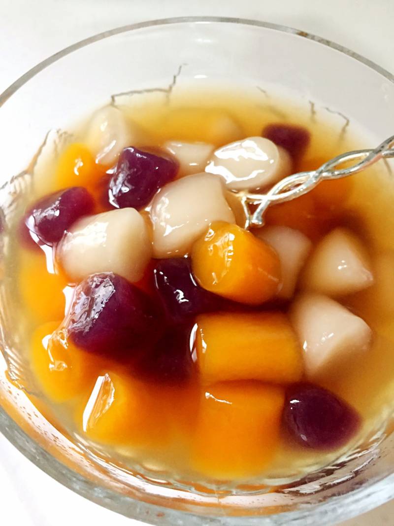 6:甜汤先另外煮好(甜汤可以用椰奶,或红豆汤或西米露,也可以直接放冰糖水煮),煮好的芋圆先放入凉开水里,再捞出放入甜汤内,冷藏和热饮味道都不错哦!