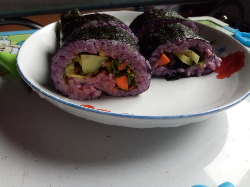 寿司海苔1张;紫薯适量;米饭适量;萝卜适量;黄瓜适量;老干妈适量;豆瓣酱适量;牛肉块适量;香菜适量;