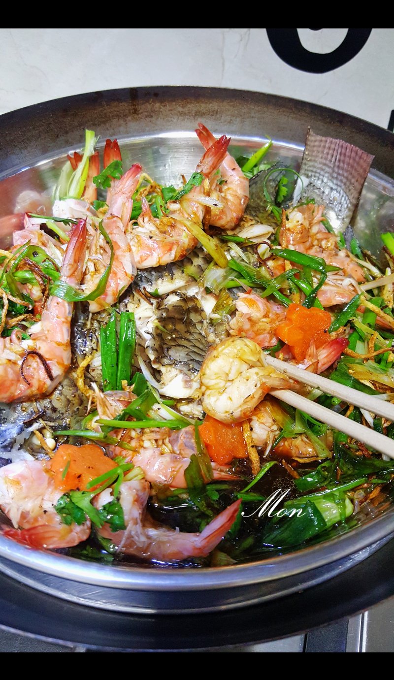 罗非鱼1条;沙虾250g;葱适量;姜适量;芫茜适量;红萝卜适量;果皮适量;
