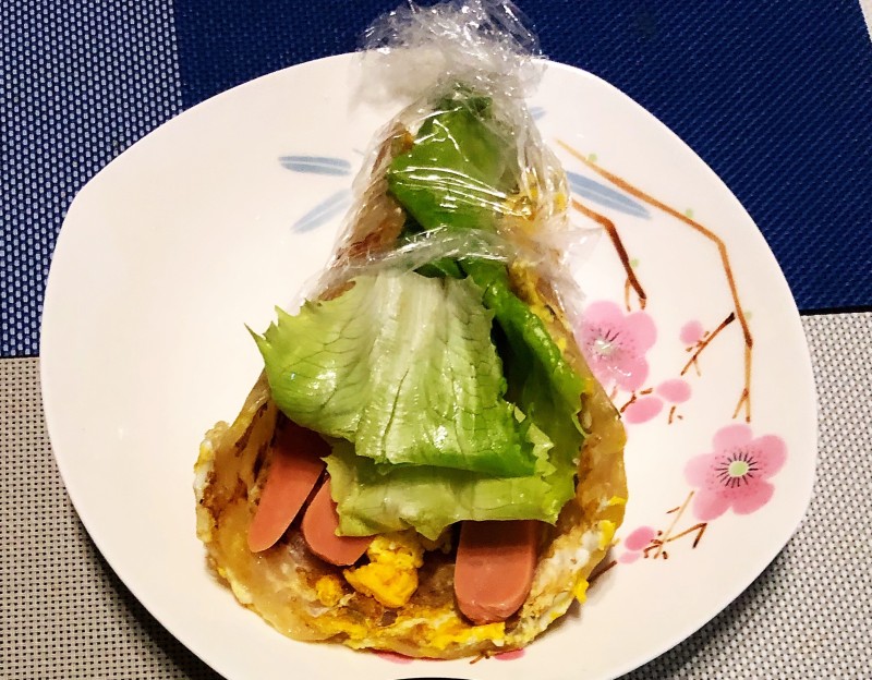 4:鸡蛋这一面的手抓饼煎好以后出锅,放入火腿肠和生菜叶。