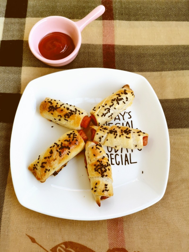 3:1火腿肠切成2节,沿着手抓饼皮从上往下卷起来
