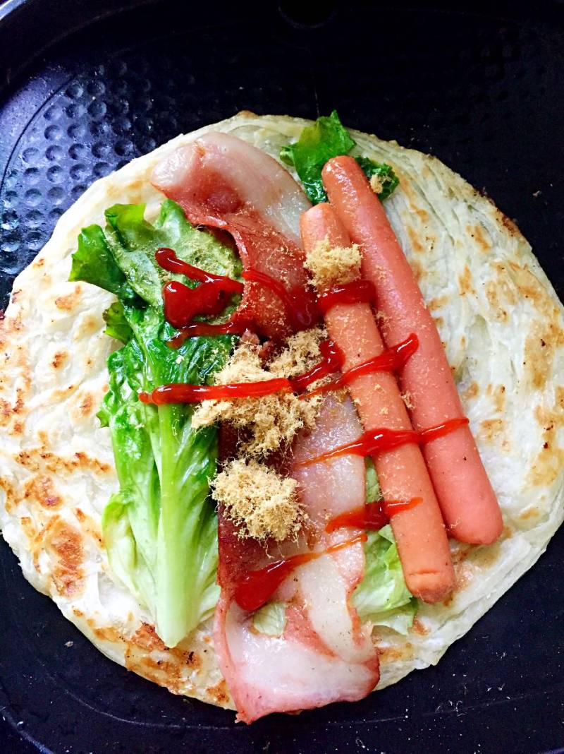 手抓饼一张;火腿一根;生菜适量;培根2卷;