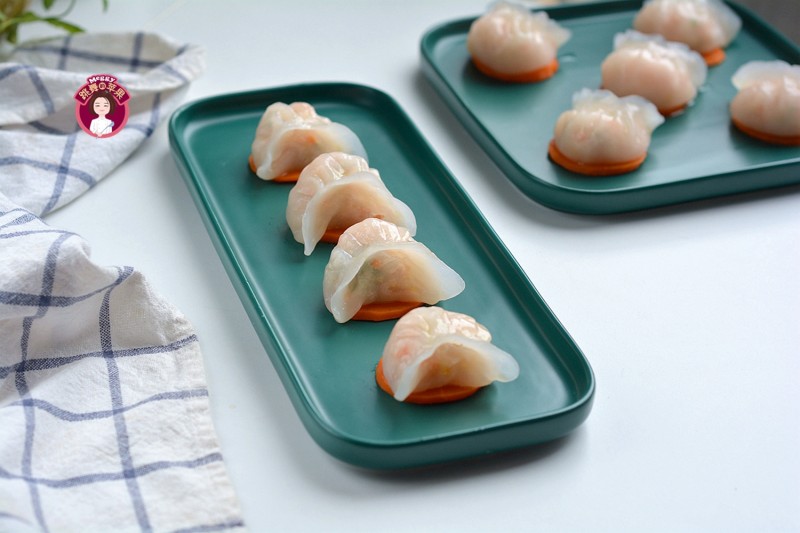 蒸笼下面要垫上一块胡萝卜或者别的东西,这样蒸好的虾饺方便取出,不会破损