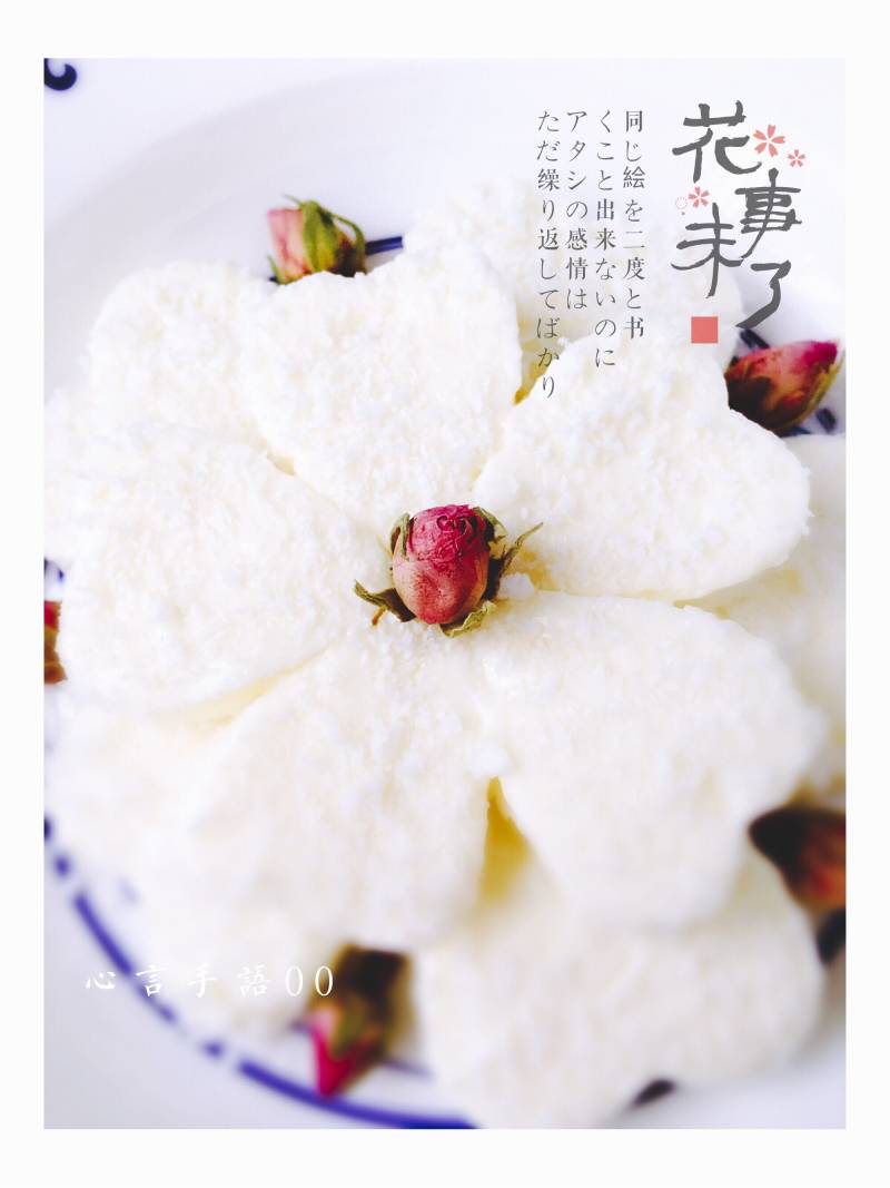 9:将奶块用心形模具切割,摆成花形,用干玫瑰花点缀。