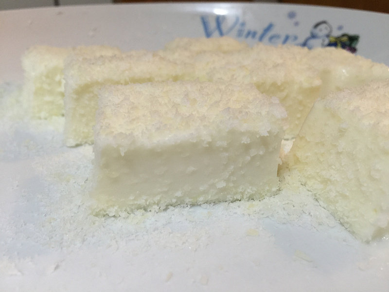 8:冷藏后切小方块,然后在椰蓉里让小方块裹上椰蓉