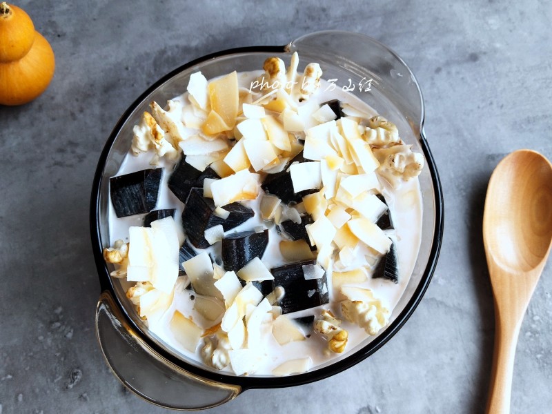 7:碗里放入烧仙草,摆上几个去皮的核桃仁。