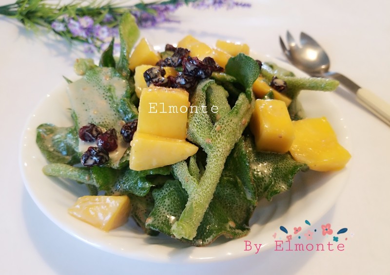 7:把芒果,蔓越莓干放入冰菜里,拌匀即可。