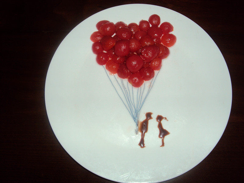 1:1.先把圣女果在上面切三刀,注意不要切到底,然后一瓣一瓣的分开。