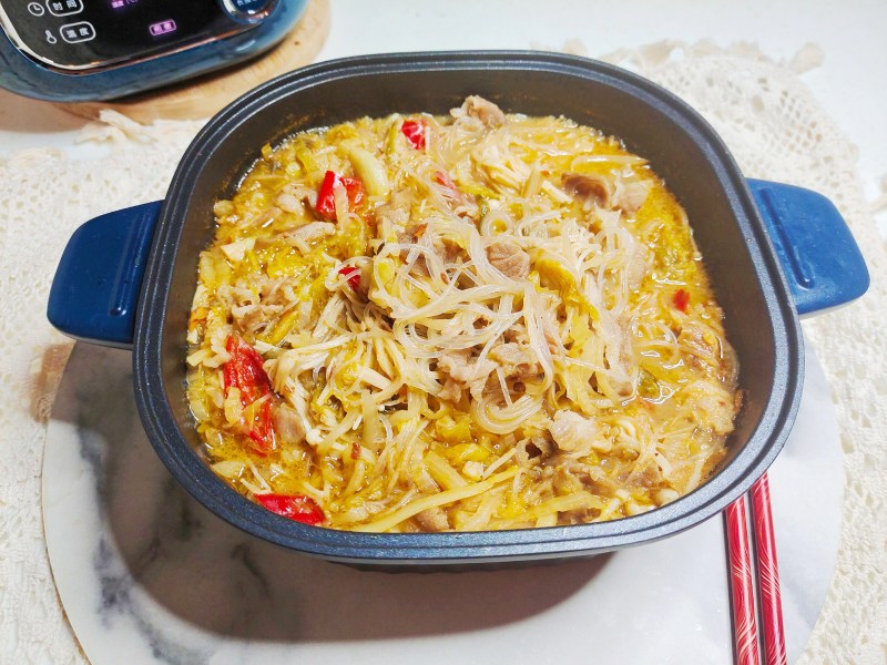 3:粉丝放锅底,加入炒好的豆泡白菜。