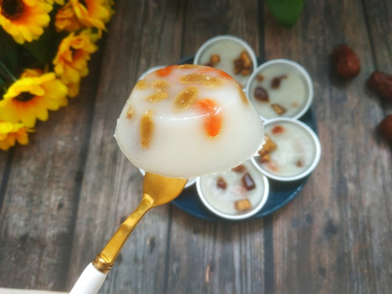 3:煮开的糖水马上倒入粉浆中搅拌均匀,倒入茶杯中蒸十二分钟,摊凉就可以吃了。