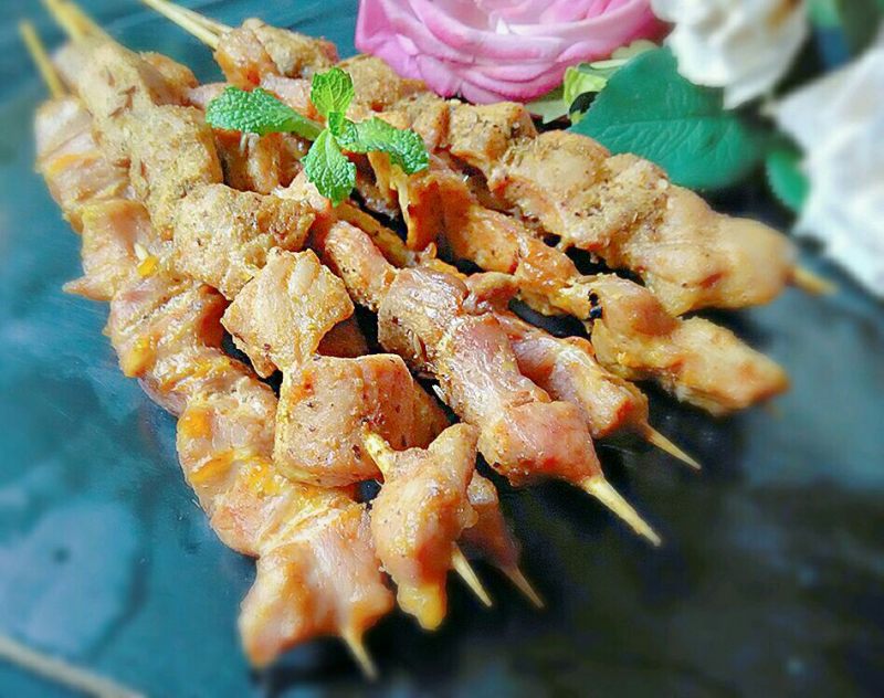 3:将腌制好的鸡肉和青红椒洋葱均匀的穿在钳子上