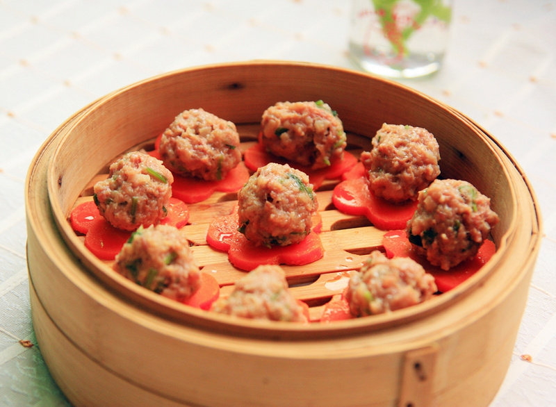 10:蒸笼上放胡萝卜片,将牛肉糜挤出一个个小圆球放在胡萝卜片上