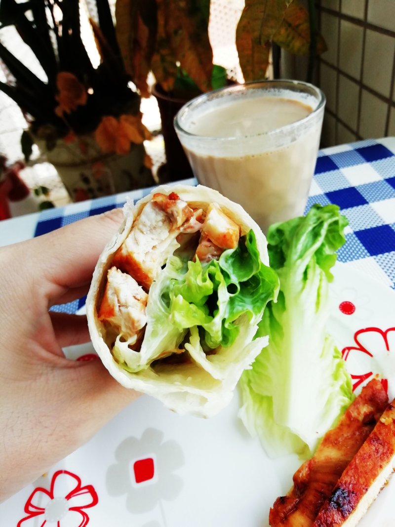 鸡胸肉提前一天腌制,第二天再煎比较容易入味,单饼是提前做好冰在冰箱里的用的时候解冻在平底锅里,一加热就可以了,特别方便。