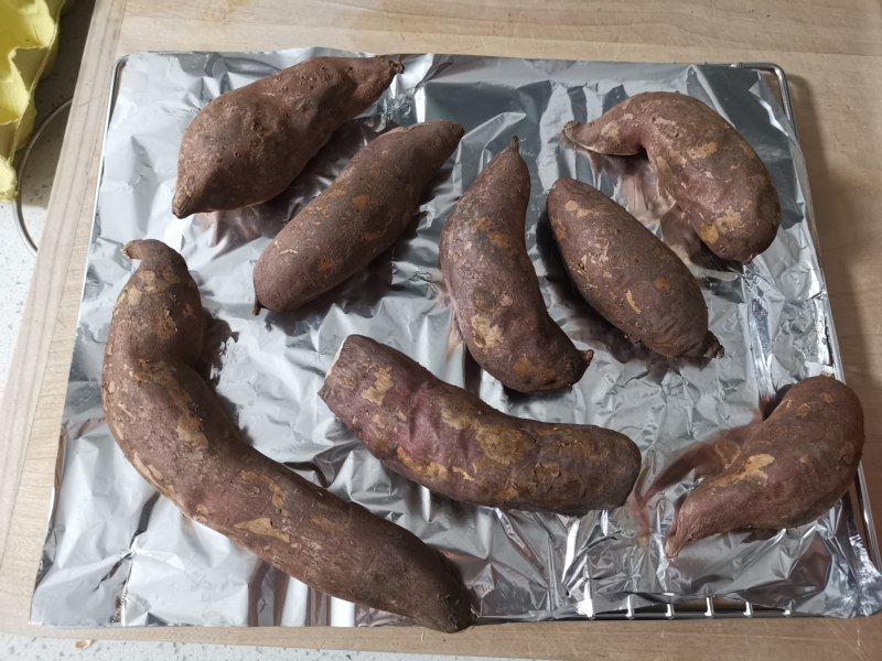 1:红薯尽量选择大小均匀的,因为在烤制过程中也会同时熟。将红薯清洗干净后放在烤盘上,烤盘铺上锡纸,这样烤红薯时流出的红薯油会滴在锡纸上,不容易弄脏烤盘,以方便清洗。在购买红薯时尽量挑选外表光滑干净的、锤形的红薯。已经发芽的或是表面有黑斑的红薯不要购买,发芽的红薯和表面有黑斑的红薯食用后会使人中毒。